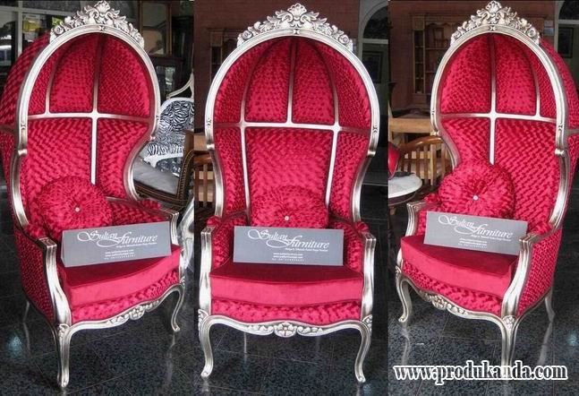 kursi kerodong design baru style mebel klasik dengan painted silver leaf paper sehingga membuat kesan kursi klasik kerodong ini tampak lebih glamar dan dipadu dengan warna kain merah ngejreng sehingga kursi kerodong atau yang sering dikenal dengan classic umbrella sofa ini tampak lebih glamor dan mewah.